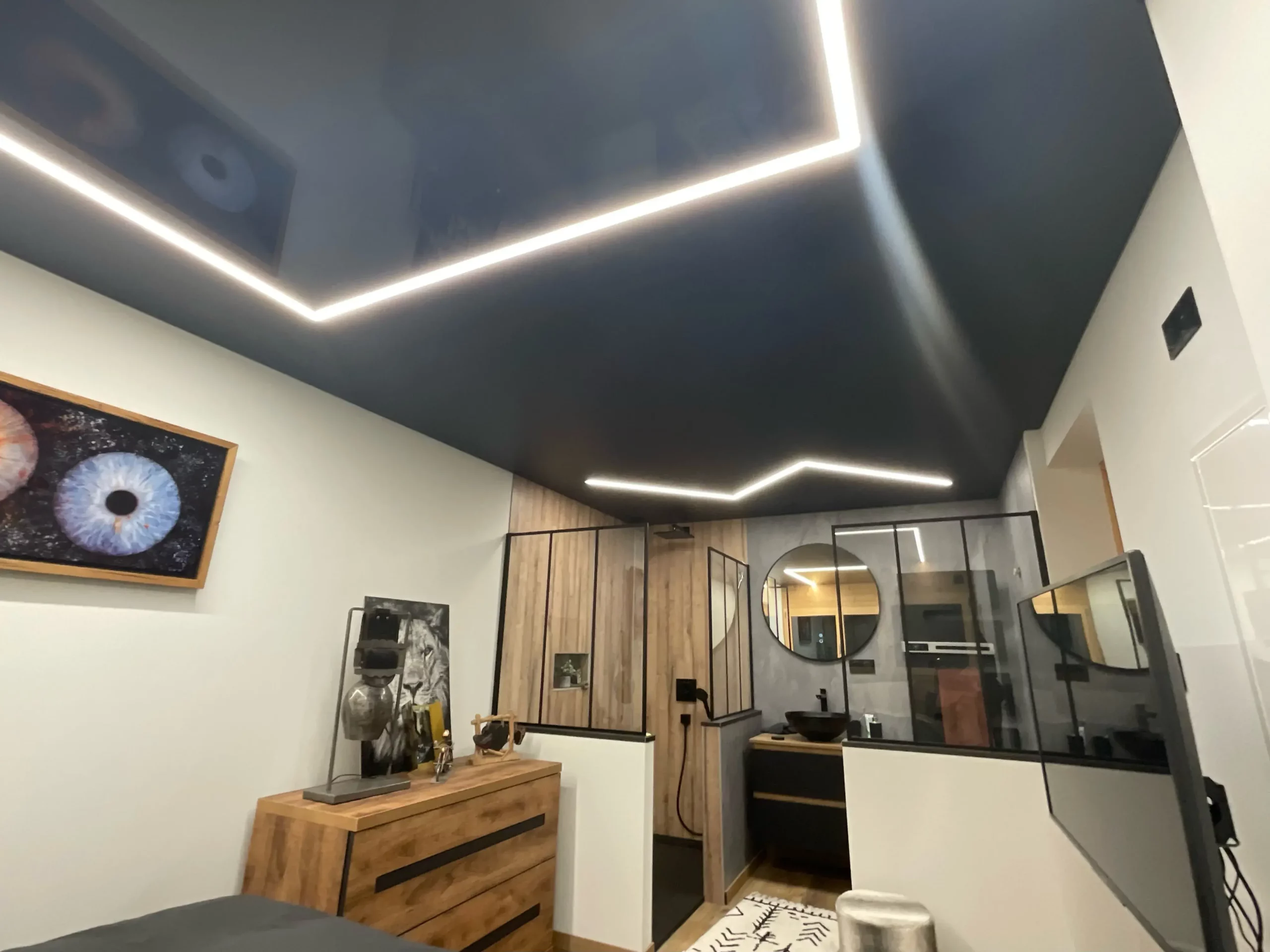 En octobre 2025, nous avons réalisé un chantier à Doubs alliant modernité et élégance. En une seule journée, la pièce a été sublimée grâce à une toile tendue noir satin offrant un rendu chic et raffiné. Dans la salle de bain, un éclairage LED en forme de Z apporte une touche graphique et design, tandis que dans la chambre, un rectangle LED intégré au-dessus de la tête de lit met en valeur la toile intérieure noir laqué pour un effet luxueux et apaisant. Ce projet illustre parfaitement l’alliance entre esthétique contemporaine et technicité, pour un résultat lumineux, harmonieux et haut de gamme.